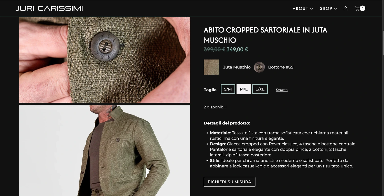 Il cuore dell’e-commerce è la scheda prodotto, progettata per andare oltre la semplice vendita. Ogni capo è collegato dinamicamente a tessuto e bottone, andando così oltre gli scatti fotografici e la descrizione, permettendo all’utente di scoprire altri prodotti con le stesse finiture.