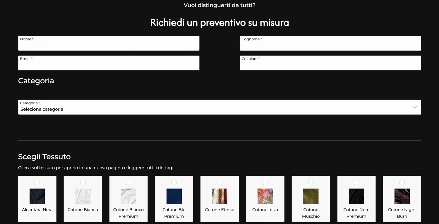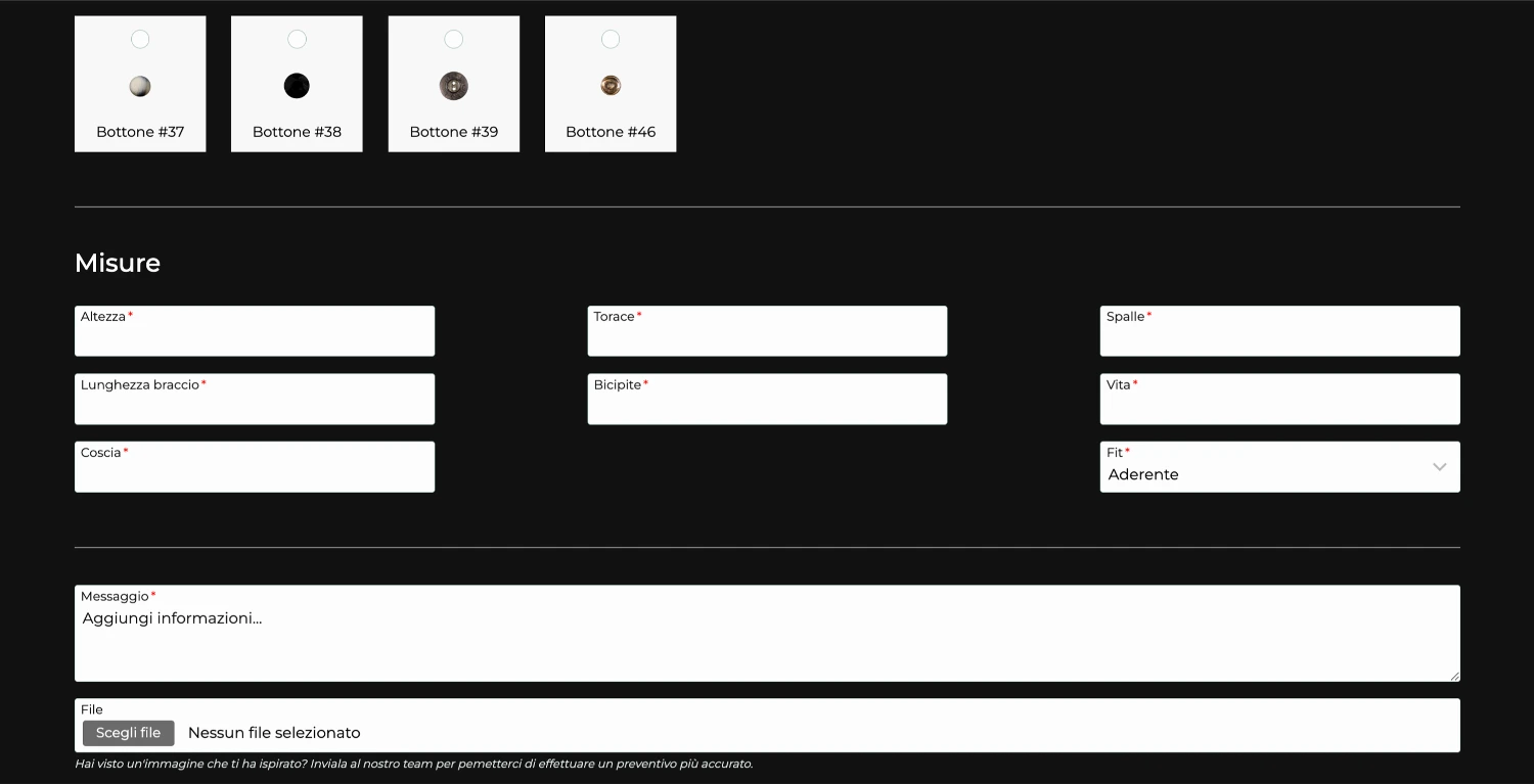 L’esperienza sartoriale si completa con un form di preventivo avanzato. Il cliente può configurare il proprio abito su misura selezionando tessuti e bottoni direttamente dal campionario digitale, fornendo tutti i dati necessari per ricevere una quotazione precisa e personalizzata.